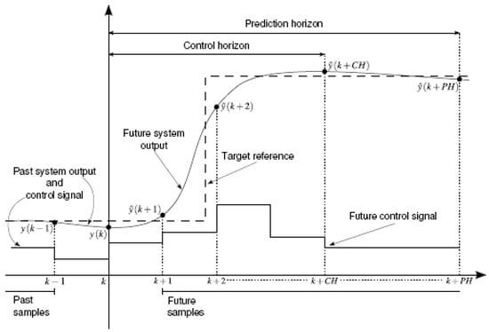 Model-based predictive control [40] is a general control engineering framework in which the controllers employ predictive plant models to obtain predictions of the future system behavior. These models are the basis for computing future control actions by minimization of a pre-defined objective function. The general principle of MBPC is illustrated in Figure 10. The controller uses past input/output system data and predictions of the future system behavior to compute the future control actions that minimize a specified cost function. Using this principle, several approaches have been proposed that differ mainly in the type of predictive plant models, the strategy to find the sequence of future control actions, the cost function employed, and the way constraints are handled.