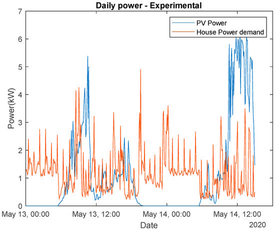 Foremost of crucial importance for this work is the description of the photovoltaic and storage systems. The building’s energy system is composed of a photovoltaic installation consisting of 20 Sharp NU-AK panels with a maximum power of 300 W each, organized in two strings. A Kostal Plenticore Plus Inverter is used, with a storage capacity of 11.5 kWh using a BYD Battery Box HV H11.5. The variables related to this equipment are sampled with a one-minute interval. The inverter has a proprietary system that manages the energy from the PV and battery, and the experimental results shown throughout the paper are a result of the operation of this proprietary system. Also noteworthy is that the building has one intelligent weather station (described in detail in [38]). This device measures the variables of air temperature, relative humidity, and global solar radiation, and it also predicts their evolution in time within a self-defined prediction horizon (details on the forecast methods are presented in [38]).