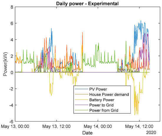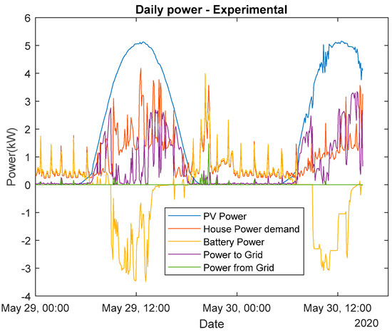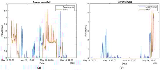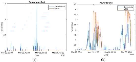 In the case of this sunny day, the MBPC did not have to buy any energy from the grid (Figure 20a), while it could still export a significant quantity of energy (Figure 20b). A summary of the evolution of the signals described before can be found in the next figures, with the first one using the experimental data (Figure 21) and the next one the MBPC (Figure 22).