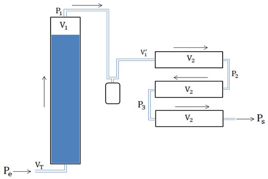 It is necessary to know the pressure at the outlet of the purification system to be able to determine the volume of gas stored as a function of time. Figure 2 shows a two-dimensional view of the system with the different pressure points to be taken into account.