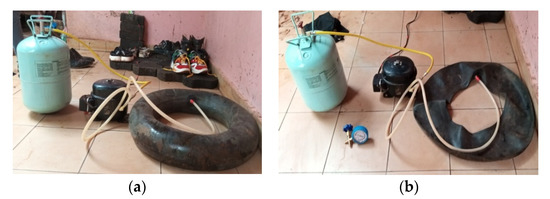 After storage in a car inner tube, the biomethane was compressed in a bottle of R134a (refrigerant gas), as shown in Figure 3.