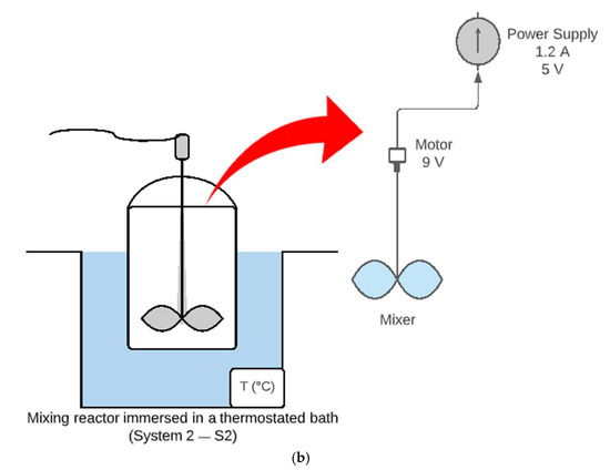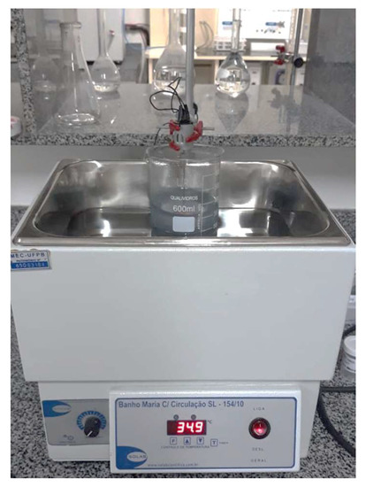 Finite bath tests were performed in duplicate. The two systems used were Dubnoff shaker bath—system 1 (S1), and a mixing reactor immersed in a thermostated bath, model SL-154/10, from the Solab brand—system 2 (S2). In Figure 1, it is possible to observe the schematic representation used to develop the experiments.