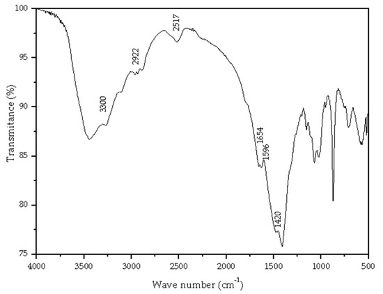 The IR spectrum is shown in Figure 3, and shows characteristic bands, due to axial deformation, in the ranges 3700–3000, 3000–2880, 1630–1400, and 1100–1000 cm−1. The wavelength range from 3700 cm−1 to 3000 cm−1 indicates NH2 and OH groups in the sample structure, since the uçá crab shell is mainly formed by proteins, chitin, and calcium carbonate. Amino groups are capable of making covalent bonds, where the electronegativity of the bonds generates sites of high polarity, making the rearrangement of molecules and water around these sites favorable [44]. In the CH axial strain region, corresponding to the 3000–2880 cm−1 interval, the uçá crab shells spectrum presents characteristic bands at 2922 cm−1. The presence of carbonate ions (CO3)2- can be verified in the range of 2517 cm−1. In the spectrum of chitosan, there are two amide-type adsorption bands at 1654 and 1596 cm−1, corresponding to the symmetric and asymmetric deformation of amide I and II, respectively, which are present in this characterization of the uçá crab shells. The band whose absorption is centered at 1420 cm−1 corresponds to the angular deformation of the glucosamine group [45]. The CO connections are confirmed by the axial deformation existing in the range of 1100–1000 cm−1. The polysaccharide bands, which are typical of chitosan, can be observed in the region between 890 and 1150 cm−1. The carbonyl amide group gives rise to strong absorption in the region of 1700–1600 cm−1, which also appear in the chitin spectrum, which is indicative of the partial deacetylation of chitin’s acetamido groups. The deacetylation of chitin in crab shells, to produce chitosan, was possible, and was confirmed by the absence of characteristic bands in this range [21,26,46].