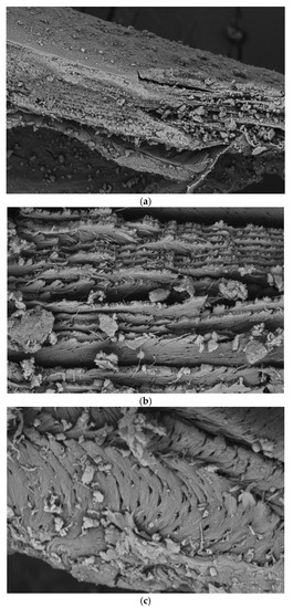 Analysis by scanning electron microscopy (SEM) allows information about the morphology to be obtained, by observing and analyzing the microstructural characteristics of solid surfaces. In arthropods, the exoskeleton consists of the following two layers: the procuticle, known as flexible chitin, which is the inner part, composed of proteins and chitin, where there is a disposition of amorphous calcite, and calcium carbonate, arranged in parallel lamellae and the epicuticle, also called rigid chitin, which is an outer layer that is formed by a complex of proteins and lipids, providing protection and waterproofing to the procuticle [48,49,50]. Through the SEM images in Figure 4, it was possible to observe successive parallel fibrous layers and channels (pores) crossing these lamellae, which can favor the diffusion of the dye into the adsorbent.
