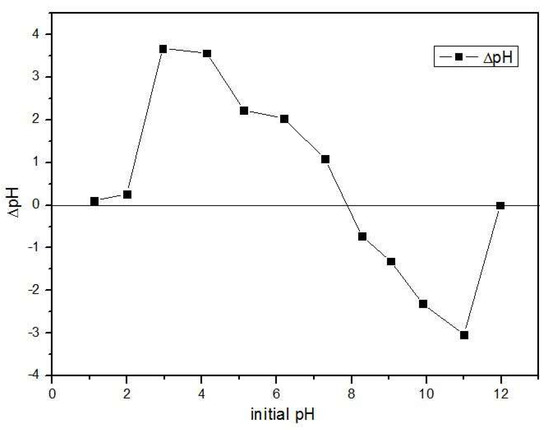The point of zero charge gives the pH value at which a solid has zero electrical charges on its surface. That is, the number of positive charges is equal to the number of negative charges. The method of determining the pH of the zero-charge point was the salt addition method, which the experimental procedure consists of adding 20 mg of the adsorbent to 20 mL of 0.1 mol·L−1 NaCl aqueous solution under 12 different initial pH conditions, adjusted with 0.1 mol·L−1 HCl or NaOH solutions. After 24 h of equilibrium in a thermostatic bath, under stirring at 100 rpm, at 25 °C, the final pH of the solution is noted [32,33,34,35].