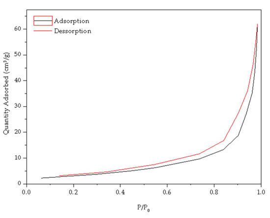 The BET plots were tracible to type V isotherms, since they showed a hysteresis cycle between the adsorption and desorption processes. Therefore, at the same partial pressure, during the desorption, more nitrogen was desorbed than gas adsorbed in the adsorption process. In the low P/P0 range, the type V isotherm shape is very similar to that of type III, and this can be attributed to relatively weak adsorbent–adsorbate interactions. At higher P/P0, molecular clustering is followed by pore filling. Type V isotherms are observed for adsorption on microporous and mesoporous adsorbents. The average pore size found by this characterization was 29,765 nm, which was classified as a mesoporous [36]. The BET isotherms made it possible to determine the BET surface area. The surface area of BET found was 11,048 m2·g−1.