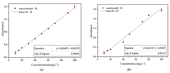 Blue reactive 222 dye solution calibration curves for (a) system 1—S1; (b) system 2—S2.