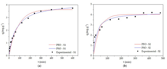 The PSO model could represent the following three conditions [52]: low initial concentration values [54], the final stage of the adsorption process, and the abundance of active sites in the adsorbent material. The concentration that was used for the adsorption tests in this work (100 mg·L−1) can be considered low compared to those used in other studies [37]. It can also be observed, by analyzing the experimental curves and models in Figure 8, that in the initial time intervals, both systems present data that better fit the PFO model. In contrast, in the final adsorption intervals, both systems (S1 and S2) fit the curve of the PSO model better. The fraction of active adsorbent sites that are occupied increases with time. A similar result was obtained in dye adsorption on chitosan-based polymer [20].