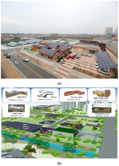 Overview of the eco-friendly energy town of Jincheon: (a) Overview of town; (b) buildings in town [29]; (c) hybrid renewable energy system in town [29].
