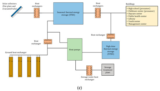 Jincheon was constructed by the end of 2016 to supply thermal energy for heating and domestic hot water throughout the year based on the 1600 m2 solar thermal system and 4000 m3 seasonal thermal energy storage (Figure 1). More detailed information on the solar thermal system and seasonal thermal energy storage can be seen in previous research [29]. Three 175 kW heat pumps, including geothermal and sewage source heat pumps, were also installed as auxiliary heat source systems. A heat pump for low-temperature surplus heat was installed in the seasonal storage tank as an evaporation heat source. The 200 m3 capacity of nighttime (i.e., off-peak time) thermal energy storage (NTES) is located in the management center and connected with heat pumps as a buffer tank. Furthermore, 850 kW photovoltaic systems are installed in public buildings, parking lot roofs, and unused sites. The generated power is sold, and the grid power is consumed to realize a net-zero-energy town [29].