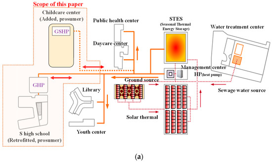 The eco-friendly energy town of Jincheon was constructed as a water quality restoration center near public buildings located in Jincheon-gun in Chungbuk Innovation City. The objective is to achieve 100% self-sufficiency in terms of the annual power and thermal energy demands by installing renewable and thermal energy systems as well as supplying eco-friendly energy to nearby public buildings. The energy produced is supplied to a library, daycare center, healthcare center, youth center, and high school, as well as five other buildings, including an integrated management center that is used as a machine and public relations room. More detailed physical information of those buildings can be seen in the previous research [29]. A childcare center was recently added to the town, and a total of seven buildings were integrated into the thermal network.