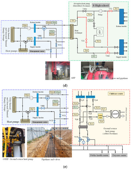 Overview of the mechanical system in the eco-friendly energy town of Jincheon: (a) Systems and building locations; (b) conventional centralized thermal network; (c) decentralized bi-directional thermal network in the network pipeline after retrofitting; (d) pipeline of the high school as a prosumer; (e) pipeline of the childcare center as a prosumer.
