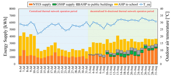 As mentioned above, the heat was supplied by the centralized thermal network method from 6 to 31 July, and a decentralized bi-directional thermal network was operated from 3 to 31 August. In Figure 3, the gray and green bars represent the heat supplied to the public building by the bi-directional thermal network from the school and childcare centers, respectively. During the experimental period, the cooling energy supplied to the school and childcare center through the heat prosumers accounts for 3.7–2.0% and 4.8–18.0% of the total cooling load of the town, respectively.