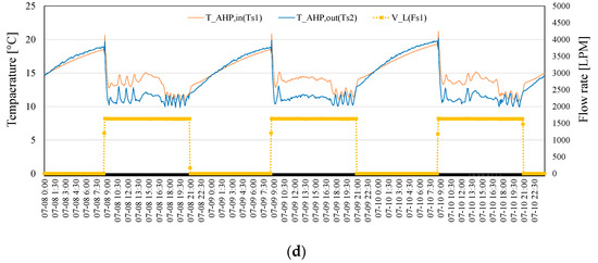 Figure 4 presents an analysis of the operation profile for the representative period from 8 to 10 July during the above-mentioned period of centralized thermal network operation. Figure 4a,b shows the inner temperature of the NTES according to thermal energy charging and discharging during the operation of the centralized thermal network. The blue area represents the heat charged into the NTES through heat pump operation (), and the orange area represents the discharging of the cooling to the thermal network from the NTES (). As mentioned above, heat is charged into the NTES through heat pump operation during the off-peak period, and when the temperature rises in the heat storage tank, cooling is charged through heat pump operation even during the peak period. The experimental results demonstrate that most heat charging occurs during the off-peak period. When the set cooling temperature cannot be maintained in the thermal network owing to a temperature increase at the bottom of the heat storage tank to more than 9 °C, heat is charged into the heat storage tank even during the peak period. Figure 4c shows the distributions of the cooling water supply temperature () and cooling water return temperature () inside the thermal network. The results confirm that the cooling water is supplied to the thermal network at approximately 11 °C and returned at 13 °C. The indoor temperatures of the buildings in the thermal network are maintained at appropriate levels. Supply temperature fluctuations occurred because the flow rate of the thermal network in actual operation is operated at a constant flow rate, and when a load is generated, the heat is supplied by the pump on/off of the primary heat exchanger in the thermal network. This phenomenon occurs when the load of a building is relatively small. Figure 4d depicts the temperature distributions according to the cooling water supply () and return () through the operation of the AHP in the school. The results show that the cooling energy supply temperature of the school is approximately 11 °C and the return temperature is approximately 14 °C, indicating a stable heat supply.