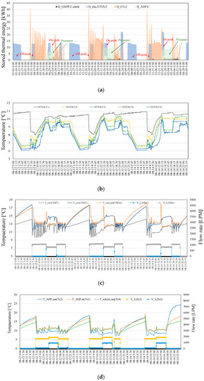 Figure 5 shows the operation profile for the representative period from August 12 to 14 during the decentralized thermal network operation period. During this period, heat was supplied by the centralized thermal network method and the heat prosumer method in combination. Figure 5a,b depicts the inner temperature of the NTES during decentralized thermal network operation. In Figure 5a, the blue area represents the heat charged into the NTES through heat pump operation () and the orange area represents the heat discharged from the NTES (). In addition, the green area represents the bi-directional heat supply from the school to the thermal network according to the prosumer operation. In the conventional centralized thermal network operation, the temperature of the NTES increases to more than 9 °C (Figure 5b); thus, the central heat pump that uses electricity must be operated even during the peak period. However, the heat prosumer of the school, which is an AHP using gas, assists in reducing the power consumption during the peak period using the non-electric thermal energy production facility. Regarding heat prosumer operation, Figure 5c reveals that there is no flow to the school in the conventional thermal network (Figure 4c), although a pipe connected to the school was operated for heat prosumer operation (i.e., FM4). During heat prosumer operation, the temperatures corresponding to TM7 and TM10 are the same, confirming the possibility of receiving cooling energy from the heat pipe of the school and supplying it to the public building. An examination of the operation status of the heat pipe of the school during the same time period confirms that, as shown in Figure 5d, the flow rate (Fs2) of the school side of the heat exchanger connected to the thermal network is generated during heat prosumer operation. It is also evident that a bi-directional thermal network is able to work because the cooling water that passes through the AHP supplies cooling to the thermal network by exchanging heat through the heat exchanger, increasing the heat exchanger outlet temperature in the school ().