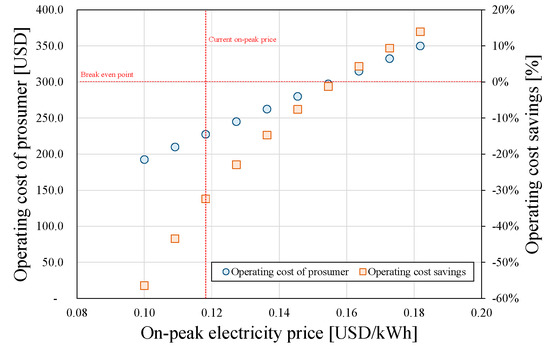 Regarding carbon emissions reduction, South Korea has high CO2 emissions from power generation. It is estimated that this high emission level occurs because coal-fired power plants, which have low power production costs but high CO2 emissions, constitute the major source of power generation [30]. If natural-gas-fired power plants are used instead, CO2 emissions will be reduced, but the power generation cost will rise to 0.09 USD/kWh, resulting in a 28% higher power generation cost than that of coal-fired power plants, which is 0.07 USD/kWh. However, the use of natural-gas-fired power plants will continuously increase with international efforts to reduce carbon emissions, and the peak electric price is expected to increase gradually as a result. Consequently, the utilization of a non-electric thermal supply is expected to increase.