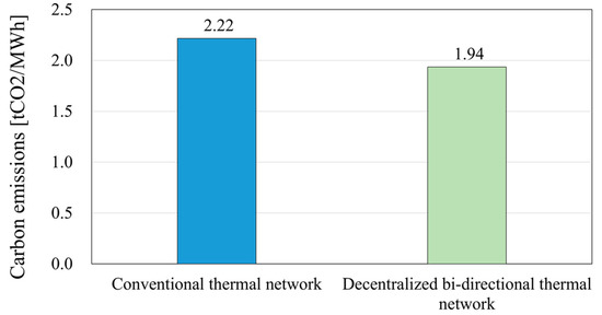 The reduction rate of carbon emissions was analyzed using the demonstration operation. The results showed that the demonstration operation generated total carbon emissions of 5.75 tCO2 in the conventional centralized thermal network method, whereas the operation of the decentralized heat prosumers produced total carbon emissions of 7.15 tCO2. However, the total cooling load of the town was smaller during centralized thermal network operation in the demonstration experiment. Thus, the greenhouse gas generation related to the total cooling load (in megawatt-hours) of the town was calculated accordingly. Consequently, as shown in Figure 7, the conventional centralized thermal network method produces 2.22 tCO2/MWh of carbon emissions, whereas the decentralized heat prosumers yield 1.94 tCO2/MWh of carbon emissions. Hence, the carbon emission is reduced by 12.7%.