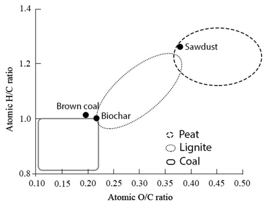 Thus, in the course of heat treatment, as expected, deoxygenation and an increase in carbon in the material took place. One of the advantages of the hydrothermal carbonization process is the ability to obtain a carbon product of the required quality. According to literary sources [] low quality coals, in particular brown coal, achieved the highest conversion during thermal dissolution in a hydrogen donor solvent, in comparison with high quality coals. From Table 1, it follows that the obtained biochar has very similar characteristics with brown coals, which also can be seen in the van Krevelen diagram (Figure 1). The van Krevelen diagram can be viewed as a schematic representation of the evolution as biochar after hydrothermal carbonization based on the main components of the fuel (C, O, H) []. It should be noted that the hydrothermal treatment of sawdust led to the displacement of the biochar to the area of coals, which indicates the significant dehydration of the material. Considering the similarity of the properties of biochar and brown coals, biochar can potentially be considered as a carbon material with high reactivity during thermal dissolution.