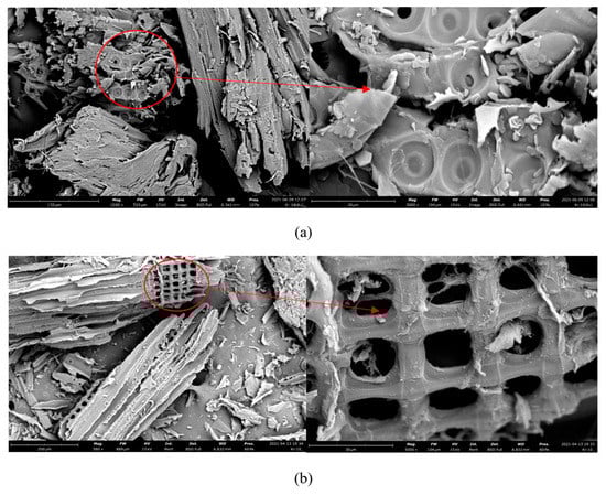 Biochar retains the fibrous structure of the original sawdust (Figure 2b). However, the treatment led to the partial destruction and decomposition of cellulose components in the sawdust, which led to the formation of a rougher surface on the material, with pieces of nondegraded fiber. Similar relationships are observed for other types of lignocellulosic biomass []. At a higher resolution, a row of hollow square tubes can be seen. It is assumed that such tubes can be formed as a result of the decomposition of cellulose sawdust micelles inside the microfibril they form. The boundaries of microfibrils are indistinct, apparently due to the partial melting of lignin, which is part of the original sawdust. It can be assumed that lignin prevents the decomposition of a part of the cellulose that forms the outer layer of the microfibril, and it remains in the biochar composition. Studies also show that part of the cellulose, and sometimes a very small part of the hemicellulose, is retained in biochar after hydrothermal treatment [,].