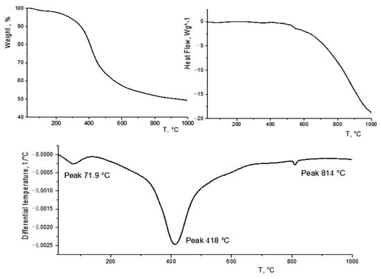 Figure 3 shows a biochar derivatogram. As follows from the TGA–DTG data, biochar weight loss is observed in two stages. At the first stage (below 100 °C), water is lost. The weight loss in this area is small and was only 1.6%, since a dry sample was used. Above 150 °C, the main change in the weight of the sample begins, which ends at a temperature of about 900 °C. The total weight loss was 49%. At the same time, in the temperature range of 200–300 °C, characteristic of the thermal decomposition of hemicellulose and cellulose [], the weight loss was relatively small (about 10%), which indicates a significant decomposition of these components of the biomass in the process of hydrothermal carbonization. Nevertheless, there are still some of them in the biochar. It should be noted that no thermal effects are observed in this area. In the literature, there are similar dependences for biochars also obtained by the method of the hydrothermal carbonization of sawdust [].