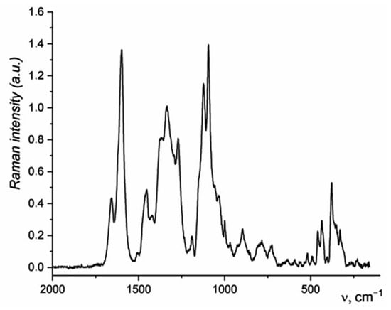 The Raman spectrum of the wood pulp is shown in Figure 4. The Raman spectrum of the sample contains bands related to the stretching and deformation vibrations of functional groups of cellulose, hemicellulose, and lignin []. A high intensity band at 1598 cm−1 corresponds to the vibrations of aromatic rings; at 1657 cm−1, to stretching vibrations of C=O groups conjugated to an aromatic ring.