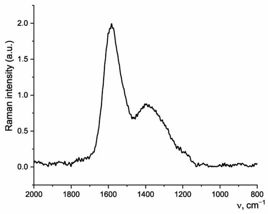 The Raman spectrum of the sample after hydrothermal carbonization (Figure 5) contains a high intensity G-band at 1595 cm−1 and a wide D band with a pronounced maximum at 1400 cm−1, which is typical for the Raman spectra of coals []. The G band corresponds to the stretching vibrations of sp2-hybridized carbon atoms in aromatic rings and carbon chains. The D band corresponds to defects in the graphite structure (for example, nonhexagonal rings, sp3-hybridized carbon atoms). The data obtained indicate the appearance of amorphous carbon in biochar, as well as a denser carbon packing. No bands related to the vibrations of C=O groups were found in the Raman spectrum of biochar, which correlates with the significant deoxidation of the material.