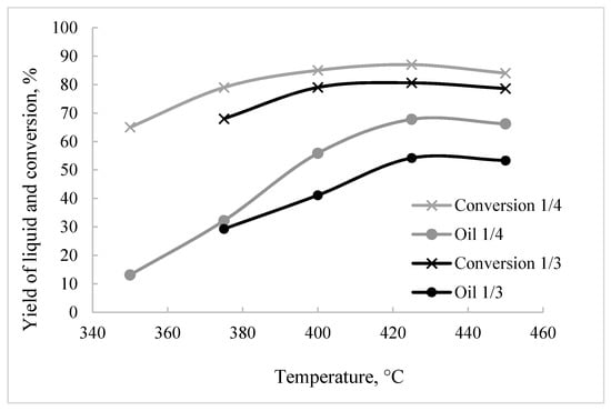 It was found that the highest conversion and yield of liquid biochar for thermal dissolution were observed at 425 °C. It is known that, for natural brown coals, the optimal temperature is also 425 °C []. However, the yield of liquids and conversion of biochar was higher than that of subbituminous coals at the same temperature and dilution, which may indicate a higher reactivity of biochar []. This fact is possibly related to the difference in the morphology and degree of metamorphism of freshly synthesized biochar in comparison with coal formed over many years under natural conditions.