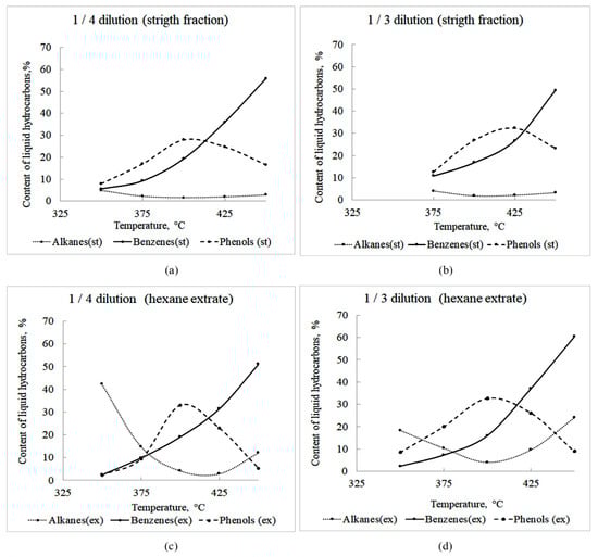 Liquid hydrocarbon products are the target products of the thermal dissolution of biomass. They were found in the composition of two fractions: (a) the “direct fraction” obtained by separation from the precipitate during filtration of the thermal dissolution products; and (b) the “extract” obtained by extraction with hexane from the isolated precipitate. Figure 7 illustrates the effect of temperature and dilution with tetralin on the content of liquid hydrocarbons (alkanes and benzenes) and liquid oxygen containing compounds (in the example of phenols) in the products of thermal dissolution of biochar. The amount of alkanes in the obtained direct liquid fractions was relatively small and did not exceed 5% (Figure 7a,b). However, in hexane extracts, the proportion of these compounds was quite high. For example, the extract obtained at 350 °C and dilution 1/4 (wt.) contained 42% alkanes. As expected, an increase in tetralin in the initial mixture led to an increase in the yield of alkanes.