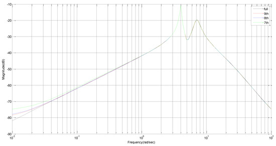 The open-loop system, where the local controller is not concluded, is of 76 orders and the reduced-order system is obtained by the Schur balanced truncation reduction technique. The frequency responses of a system with 76 orders, 9 orders and 8, orders are presented in Figure 3, and they are very close, over 0.1–2.5 Hz. Hence, the 8th order system model is used for the simulation.