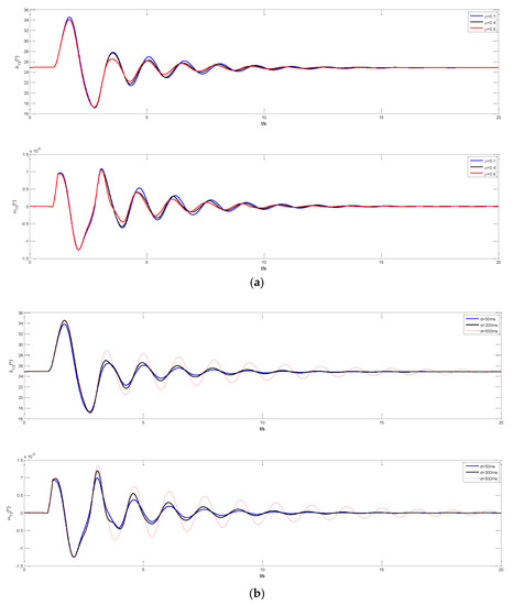 To further clarify this, the simulation is carried out under different packet loss rates where G1 is equipped with our proposed controller. The difference between angular velocity and rotor angle of G1 and G3 is selected as performance index. Three-phase short-circuit occurs at and is removed at . For the same delay , the response caves of and under different packet loss rates are shown in Figure 4a and for , the response caves of and under different delays are Figure 4b.