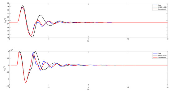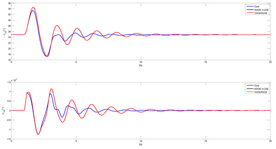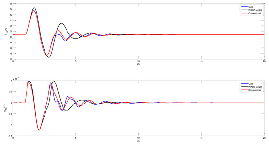 It can be easily seen from Figure 8, Figure 9, Figure 10 and Table 4 that except for the slightly larger overshoot of in Figure 9, our proposed controller can stabilize the system in a shorter time and have smaller overshoot under different external disturbances when packet loss occurs.