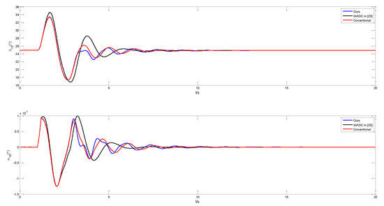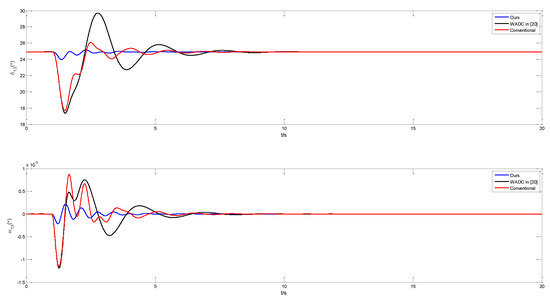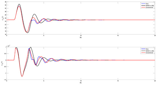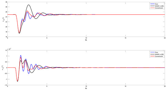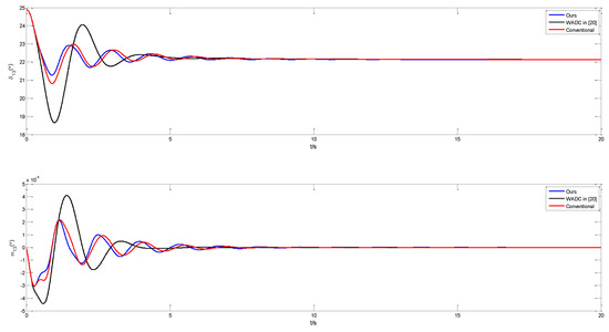 It is obviously seen from Figure 11, Figure 12, Figure 13 that though all the controllers can stabilize the system when external disturbances occur, our proposed controller has a better dynamic performance and can stabilize the system in a shorter time. The higher the packet loss rate, the more obvious the advantage. Due to the limitation of space, we will not present other results in this paper. In all, our proposed controller, compared with WADC in [20] and conventional controller, can provide more adequate damping and have better dynamic performance.
