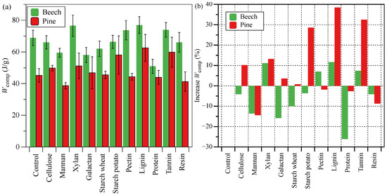 (a) Compression work (Wcomp) for all samples (J/g) and (b) change of Wcomp compared to pure beech and pine [% (wb)].