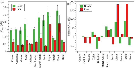 In this study, two different extractives, tannin and resin, were tested. It is clear that resin acted as it did in earlier research studies and decreased the Fmax as shown in Figure 2b. However, tannin countered the resin, by increasing Fmax.