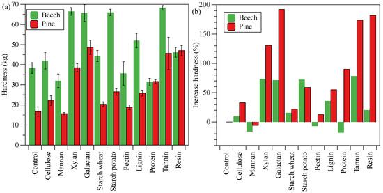 As far as wheat and potato starch are concerned, it can be seen in Figure 3b that there was a difference between the effects they had on hardness as potato starch generated harder pellets than wheat starch in both beech and pine. On the contrary, Ståhl et al. (2012) showed higher durability for native wheat starch than for native potato starch [44].