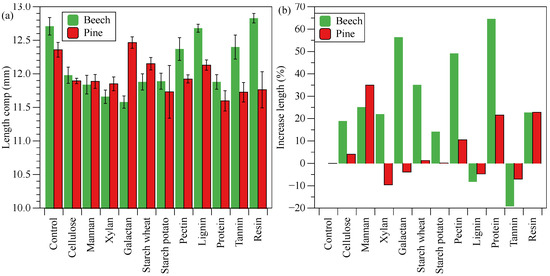 Regarding the compression length, i.e., the length of the pellet inside the die before the pressure is released, Figure 4a shows only small differences among all samples, and almost regardless of which substance is used, beech showed a greater springback effect (Figure 4b), especially when galactan, pectin, and protein were added. However, for pine, there was no springback when galactan was added.
