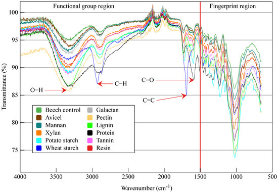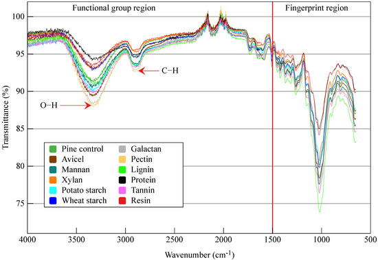 In comparison to the pine control, only three of the substances (wheat starch, mannan, and protein) showed reduced peak intensity in terms of the height of the peaks around the O–H region, and in the C–H region, five of the substances (pectin, galactan, tannin, lignin, and resin) displayed increased peak intensity, which is an indication of a higher concentration of the C–H groups. It should be noted that there is a relationship between peak intensity and the concentration of functional groups (Beer–Lambert’s law), as previously explained. Once again, why some substances produced harder pellets than others could not be established from the spectral information for reasons given previously. However, there seemed to be clear differences between the IR spectra of the Pine pellets in Figure 6 and those of the beech pellets previously presented in Figure 5. The spectra of both controls (pine and beech pellets) with the same types and amounts of added substances typically differed around the functional group region, which was noticeable in the number of peaks (only two peaks for Figure 4) and the intensity of the peaks in terms of height. The two peaks were displayed at around 3335 and 2750 cm−1, which, as indicated in Figure 6, were linked to the O–H and C–H groups, respectively. Moreover, the intensity of the peak depicting the C–H group in Figure 6 was lower than those for beech and its added substances in the previous figure, coupled with the fact that no peaks could be observed in the region associated with the C=O and the C=C groups (1850 and 1650 cm−1) as in the case of Figure 5, which is an indication that not much interaction took place upon the addition of 10% of various substances to the pine pellets. This simply means that the pine control pellet sample was less susceptible to chemical changes induced by the addition of substances and less likely to form pellets with increased hardness than beech, which agreed with the hardness data of the beech and pine pellets presented in Figure 3.