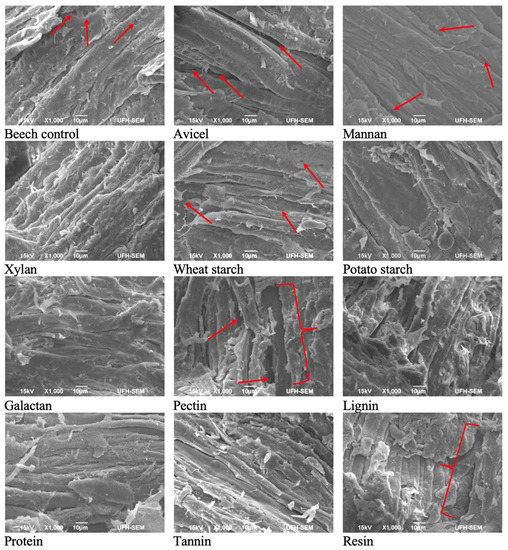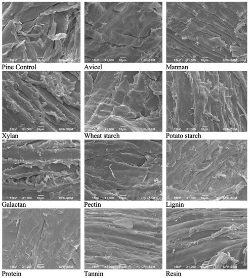 Generally, in terms of surface morphology, significant differences were noted when the images of the substances were compared with the image of the beech control. There seemed to be differences in the surface appearance of the pellet samples, which were probably caused by compositional differences and the processing conditions of the pellet press. However, the images reveal the extent of adhesion/bonding between particles, which varied with the type of substances, perhaps due to dissimilarities in the type and number of moieties (functional groups) of the biopolymeric constituents of the samples and may account for the varying degrees of hardness and springback behavior of the pellets presented in a previous section (Figure 3 and Figure 4, respectively). This may also be the reason why there was a disparity in energy consumption and frictional force during the pelletizing process, according to the data in Figure 1 and Figure 2, respectively. This is because biopolymeric constituents respond differently under the processing conditions of the pellet press [35,47]. These findings are supported by the findings of Nielson et al. (2010) and Stelte et al. (2012) [40,48], who showed that biomass polymeric components on the pellet surface strongly influence not only the appearance and unit density of pellets but also their springback behavior, energy consumption, and the frictional force of the pelletizing process. For instance, the surface morphology of the beech control is quite rough with visible spherical pores that are almost invisible in most of the substances. The visible pores were considered as areas of cohesive failure that may have been created by a lack of biopolymer interpenetration or a lack of particle inter-diffusion attributed to pressing at high temperatures. While the images of pellets with substances such as Avicel, wheat starch, pectin, and resin reveal large gaps between particles (identified by the arrows in the images) that reflect weak bonding, other substances show particles that are strongly bonded to each other; these include xylan, potato starch, galactan, lignin, protein, and tannin. This is an indication of structural differences supported by the FT-IR data presented in a previous section and could also explain the variation in the quality of the pellets in terms of hardness, considering the data in Figure 3. However, why specific pellet samples such as xylan, galactan, and tannin gave harder pellets and mannan gave softer pellets could not be immediately ascertained from this analysis. A possible explanation for the gaps seen between particles in the images of the pellet samples mentioned above is that although substances may function to improve bonding between particles, this depends on the type and composition of the substance. Therefore, it is likely that the substances that showed weaker inter-particle bonding may contain polyester substances that can limit areas of interaction where strong bonding is likely to occur. These polyester substances may act as a shield against the polymer chains of cellulose, hemicellulose, and lignin by preventing participation in bond formation and consequently limiting particle-to-particle bonding to weak van der Waals interactions and poor interlocking of fibers [40]. To prove this theory, however, a compositional analysis of beech pellets and the substances used in this study may be necessary.