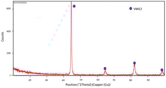 VM12-SHC steel was the substrate selected for corrosion evaluation. The chemical composition of the material was characterized as received by SEM-EDX in a weight percent of 0.38% Si, 0.25% V, 12% Cr, 0.42% Mn, 1.78% Co, 0.36% Ni, 0.39% Mo and 1.42% W and Fe in balance. These values are in line with those reported by the manufacturer []. Moreover, an XRD was performed on the material before the test (see Figure 1).