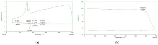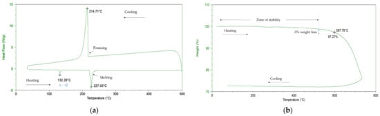 The DSC revealed a melting point of the Solar Salt at 227 °C, along with its characteristic endothermic phase solid–solid transition (α, β) of the KNO3 at around 132 °C []. This signal also appears in higher compositional formulations and can be shifted at a different heating rate []. The exothermic curve with a maximum peak at 214 °C was produced in the cooling segment slope and delayed with respect to the melting point because of atom nucleation [] (see Figure 2a). The decomposition temperature was 597 °C. This corresponds to a mass loss of 3% with respect to the stability slope (see Figure 2b).