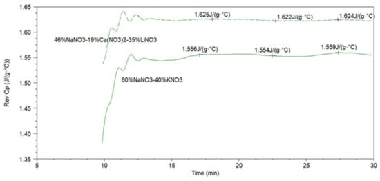 Generally, authors assign a working temperature range of 240 °C–565 °C []. The average specific heat capacity at 500 °C was 1.55 J/g °C (see Figure 3), in line with other investigations [].