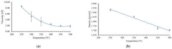 Regarding the viscosity, the average value at 300 °C was 5.06 cP, which is higher than the 3.26 cP reported by González-Roubaud []. Most of the researchers stated Arrhenius or polynomic equation types with a temperature dependence of the viscosity. In this case, the relation one fits better with the polynomic mathematic expression, µ = 0.002·T2 − 0. 140·T + 33.805 (see Figure 4a).