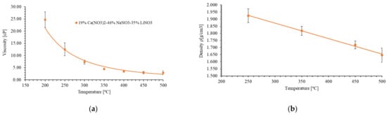 (a) Viscosity value of 19% Ca (NO3)2-46% NaNO3-35% LiNO3 at different temperatures. (b) 19% Ca (NO3)2-46% NaNO3-35% LiNO3 density values from 250 °C up to 500 °C.