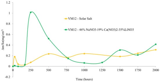 Figure 7 shows the gravimetric results of the VM12 in Solar Salt and the new ternary mixture formulated at 500 °C with a molten salt flow rate of 0.2 m/s. There was barely any weight loss when in contact with 60% NaNO3-40% KNO3. A sinusoidal shape was observed during the test when in contact with 46% NaNO3-19% Ca(NO3)2-35% LiNO3, with a gained weight mass of 0.5 mg/cm2 after 2000 h.