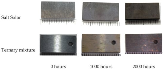 Corrosion studies were performed at an isothermal temperature of 500 °C and accelerated fluid conditions in a pilot plant. The velocity of the test was set to 0.2 m·s−1. This velocity was selected on the basis of the flow velocity, which is given in areas near to pipe bends and valves in the current CSP plants (0.2–0.5 m·s−1), which are areas where high levels of corrosion are found. This patented (ES2534850-B2) pilot plant, built in AISI 321 steel, enables one to simulate a medium flowing under real operational conditions. A place area with an alumina sample holder allows one to place specimens, with 20 × 10 mm size, parallel to the molten salt flow for degradation tests of materials. This facility was explained in detail in a previous work []; it was used to compare static conditions versus accelerated flow conditions. It is feasible equipment for simulating corrosion effects when salt circulates through steel tubes in a CSP plant.