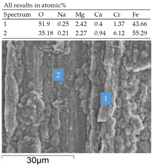 Severe delamination occurred (see Figure 10a), and a loss of corrosion products could be observed in the images of the surfaces (light color areas); this was confirmed by the increasing amount of Cr and Fe with lower O (22.43%) incidence after the SEM-EDX #1 chemical element analysis spectrum (see Figure 10b). The fluid movement provoked a pulling force that encouraged the mechanical separation of the corrosion products from the substrate.