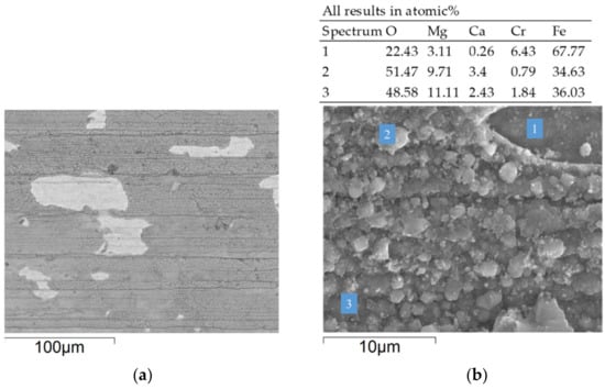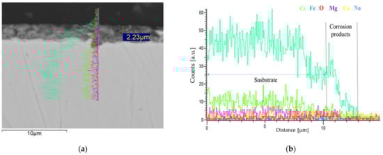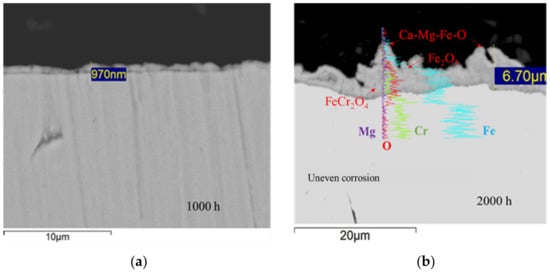 The line scan analysis indicated a majority presence of Fe, Cr and O, as well as Mg to a lesser extent. These findings are in line with the posterior structural phases identified in X-ray diffraction. The outer corrosion product scales (see Figure 11b) are promoted and formed by the impurities in molten salts at a high temperature [].