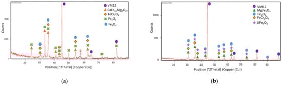 XRD analysis of VM12: (a) after “Solar Salt” in accelerated flow exposure at 500 °C for 2000 h, (b) after 19% Ca(NO3)2-46% NaNO3-35% LiNO3 in accelerated flow exposure at 500 °C for 2000 h.