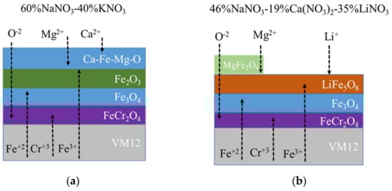 Sketches of oxide layers formed in the stainless steel after molten salt exposure; (a) Solar Salt, (b) 19% Ca (NO3)2-46% NaNO3-35% LiNO3.