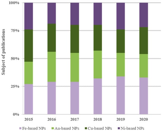 In this paper, for the convenience of discussion, four different types of NPs (Fe-based, Au-based, Cu-based, and Ni-based) were surveyed across different studies and the results are shown in Figure 1.
